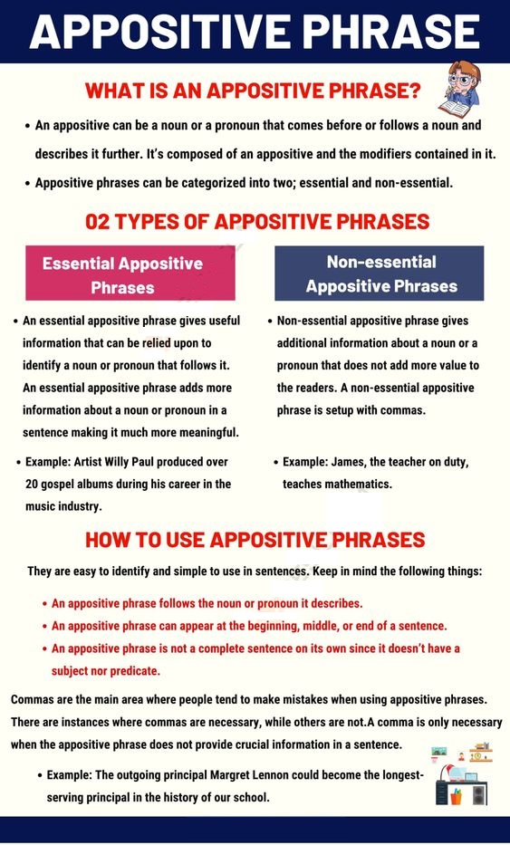 Essential appositive phrases (defining) and non-essential appositive phrases (non-defining, extra detail)