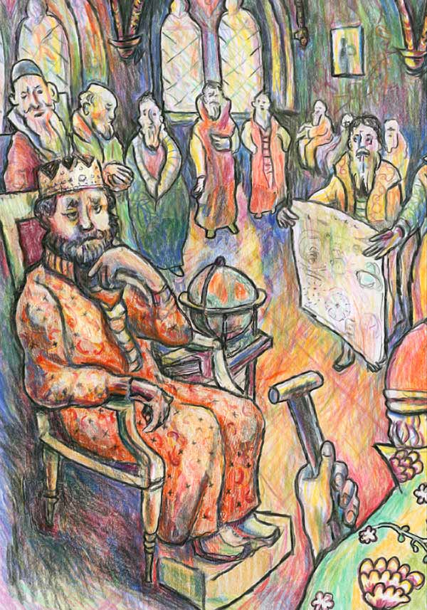 Upon awaking in the morning, the King needed time before he could remember where he was and who was the strange bearded man, gazing intently at him with shining eyes, lying on the bed.