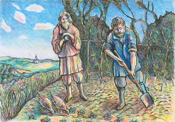 Leaving the wounded man, the King went onto the porch, looking for the hermit. The hermit, outside and on his knees, sowed seeds in the beds that they had dug the day before.